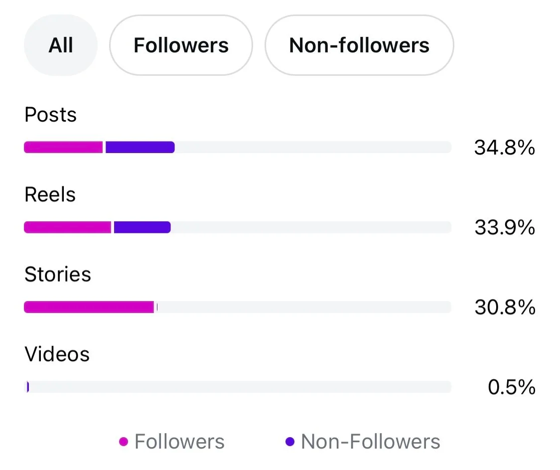 Reels are shown more to non-followers while posts, carousels, and stories are shown more to followers.