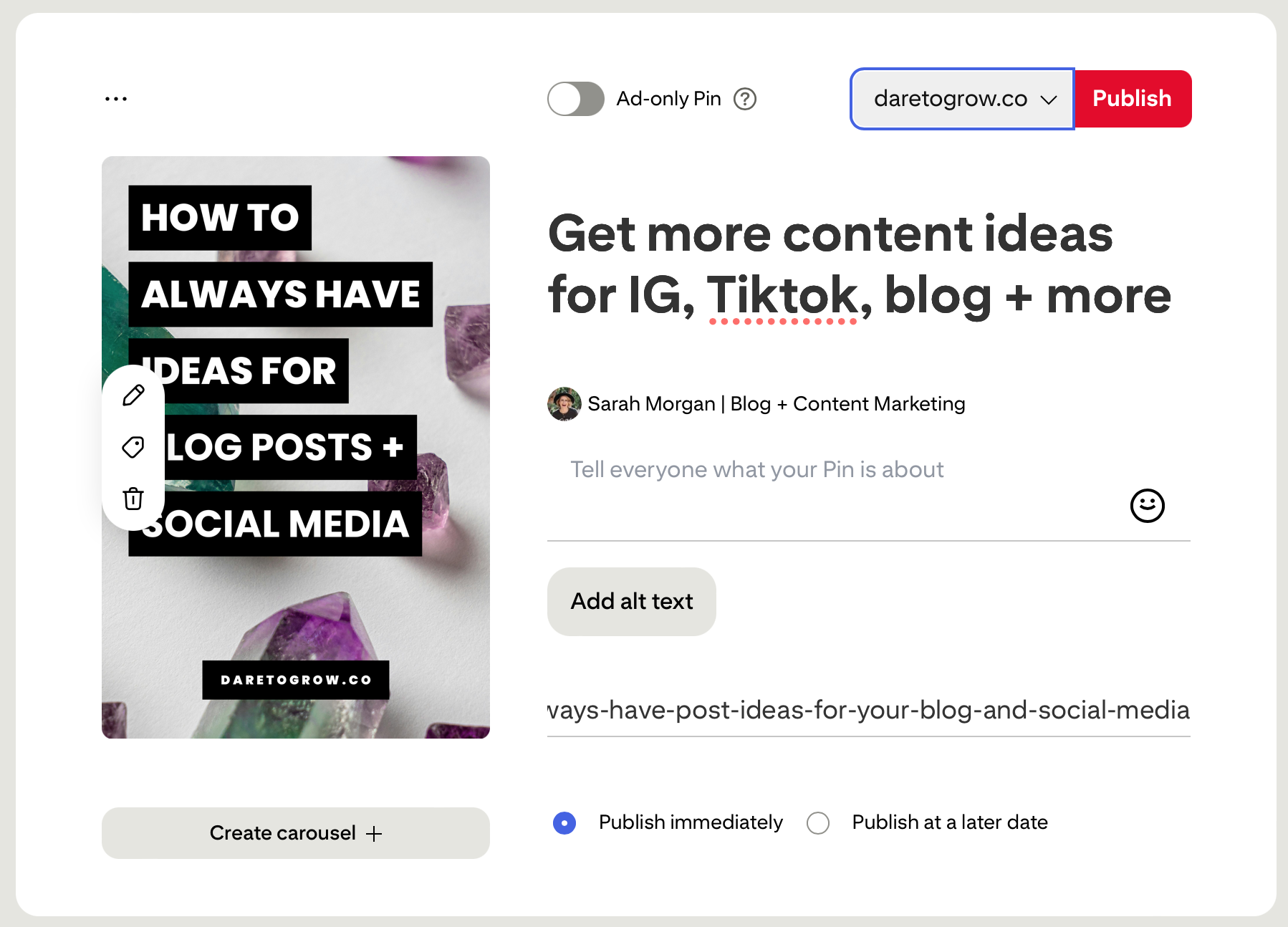If you have posts with multiple steps (like DIYs or recipes) test creating pin carousels. More images almost always equals more clicks. If you create video for Tiktok, Instagram, Youtube - post those suckers to Pinterest too. Scrolling for inspo is so much more enjoyable over there and you’ll grow a following fast because 1. It’s not popular yet, and 2. moving video stops a scroll better than an image.
